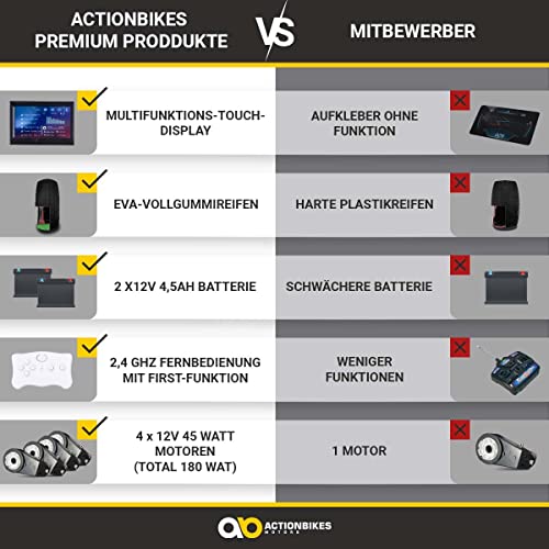 ✔ Original Actionbikes Motors ✔ 4 x 12 Volt 45 Watt Motoren ( Allgemeingültig 180 Watt ) ✔ Geräuscharme EVA-Vollgummireifen ✔ Allrad