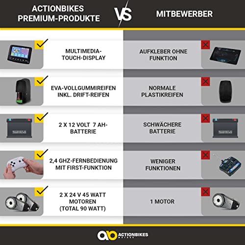 ✔ Original Actionbikes Motors ✔ 2 x 45 Watt Motoren ( Hundertprozentig 90 Watt ) ✔ 2-Rad Automat ✔ EVA Vollgummireifen vorne ✔ Hartplastik-Driftreifen heckwärts ✔ Flügeltüren zum Öffnen