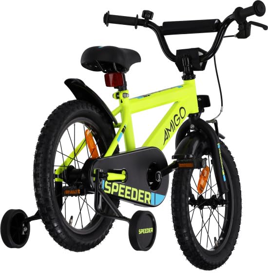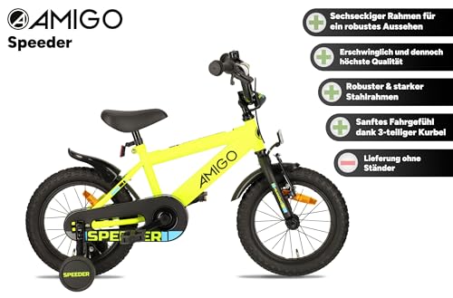 AMIGO Speeder – Kinderfahrrad – 12/14 / 16 Zoll – mit Handbremse, Rücktritt, Lenkerpolster und Stützräder – ab 3-6 Jahr – Gelb/Rot/Schwarz