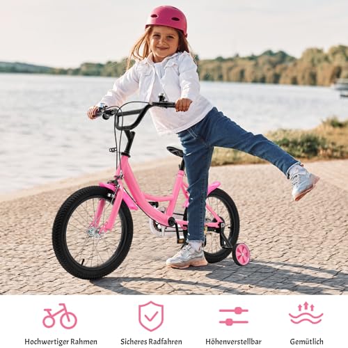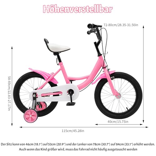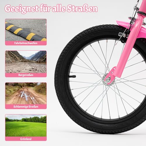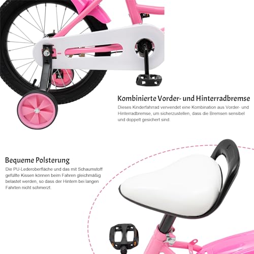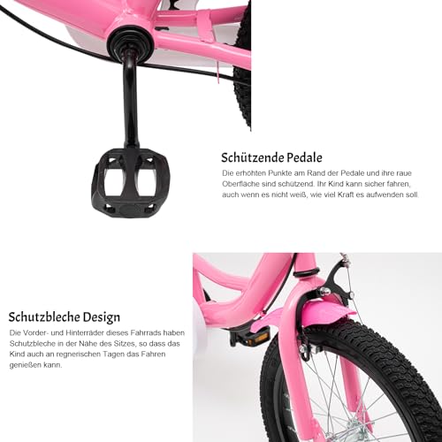 [Durchdachtes Design] Das rosa 16-Taxe-Fahrrad wird mit einer ganzen Hintereinanderstellung von Zubehörteilen geliefert, darunter abnehmbare Stützräder, ein rutschfester Lenker, ein PU-Ledersattel, schützende Pedale, Schutzbleche und vieles mehr. So garantiert es die Sicherheit Ihres Kindes beim Fahren und macht Ihr Abkömmling