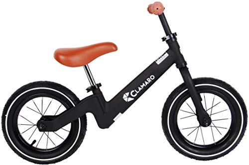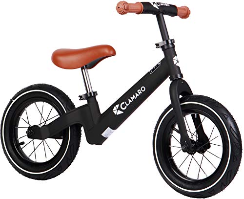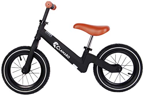 Clamaro ‚Roadstar‘ 12″ Kinder Laufrad ab 1 Jahr für Jungen und Mädchen, Balance Lauflernrad mit leichtem 3,6 kg Magnesium Aluminium Rahmen, Luftreifen und mitwachsendem Sitz und Lenker, schwarz/braun