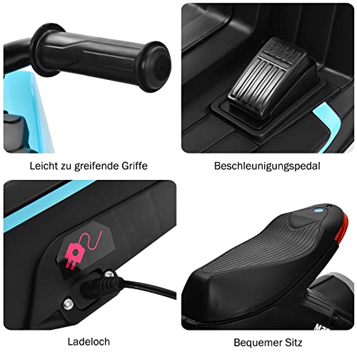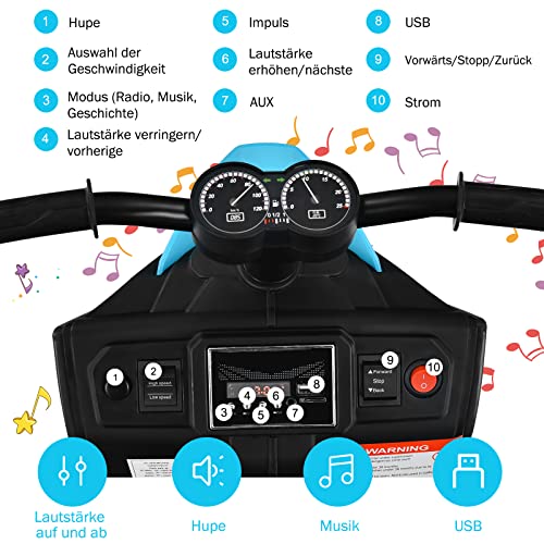 【Vielseitige Funktionen】 Dieses akkubetriebene Motorrad hat Mischung Funktionen und mehrere Schnittstellen, durch die es mit externen Geräten gekoppelt werden kann. Dadurch können Kinder da ja der Fahrt Musik oder Geschichten hören.