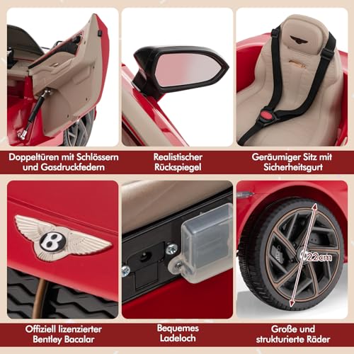 【Offiziell lizenziertes Bentley Bacalar】Dieses lizenzierte Bentley Ride-on-Auto besticht durch sein cooles Erscheinungsbild, das Kinder sehr anspricht. Doppelte Türen mit Schlössern und Gasdruckfedern sowie realistische Rückspiegel ahmen das Aussehen eines echten Bentleys nach.