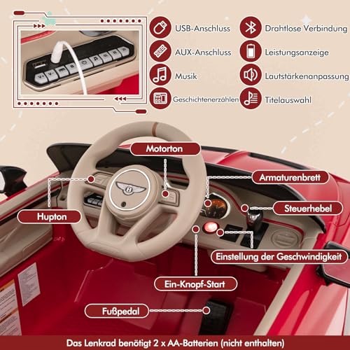 【Mehrere Unterhaltungsfunktionen】Mit Hupe, Motorengeräusch, Musik und Geschichtenerzählen ermöglicht dieses lizenzierte Bentley-Auto Kleinkindern eine lustige Fahrt. Dessen ungeachtet können Sie Ihr Handy über den USB-Anschluss, den AUX-Anschluss und die kabellose Substantiierung anschließen, um die Lieblingssongs der Kinder abzuspielen. Zusätzlich sorgen die hellen LED-Lichter An Stelle zusätzlichen Fahrspaß.