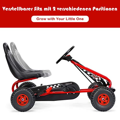 COSTWAY Gokart mit verstellbarem Sitz, Go Cart mit Handbremse, Tretauto bis 30 kg belastbar, Pedal Gokart, Tretfahrzeug, Pedalfahrzeug, Kinderfahrzeug für Kinder von 3-6 Jahren (Rot)