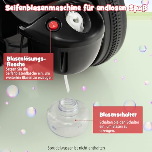 【Seifenblasenmaschine für endlosen Spaß】 Tauchen Sie ein in die traumhafte Welt der Seifenblasen mit unserem Bubble-Auto. Unser Bubble-Auto ist einfach zu bedienen – schalten Sie einfach den Seifenblasenschalter ein, um mehr als 20 Minuten lang Seifenblasen zu erzeugen und die Kinder während der Fahrt zu unterhalten. Freundlicher Tipp: Seifenwasser ist nicht enthalten.