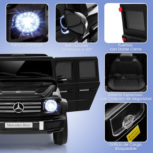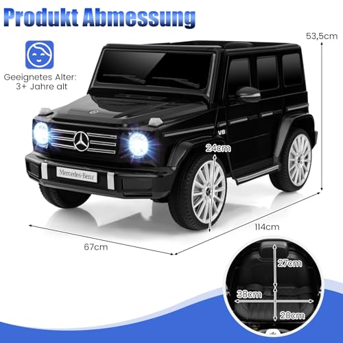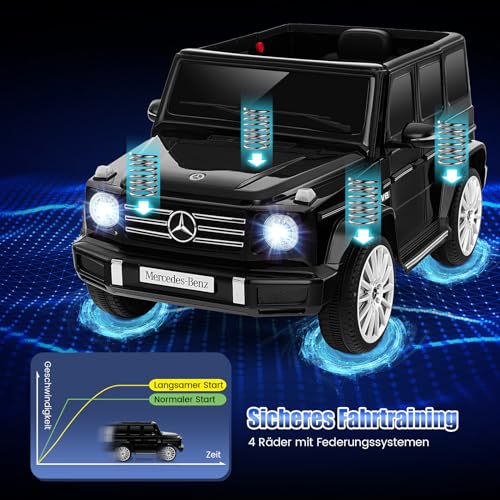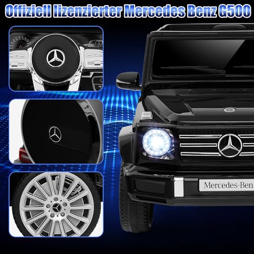 【Lizenzierter Mercedes Benz G500】Das Elektroauto verfügt über das offiziell lizenzierte Mercedes-Benz G500-Design und ist ein perfektes Geschenk für Kinder an Geburtstagen oder Feiertagen. Es gibt 4 Antriebsmotoren und einen zusätzlichen Lenkmotor für eine stärkere Antriebsleistung. Übrigens ist der 12-V-Speicherzelle mit Überlade- und Überlastschutz zäh in der Anwendung.