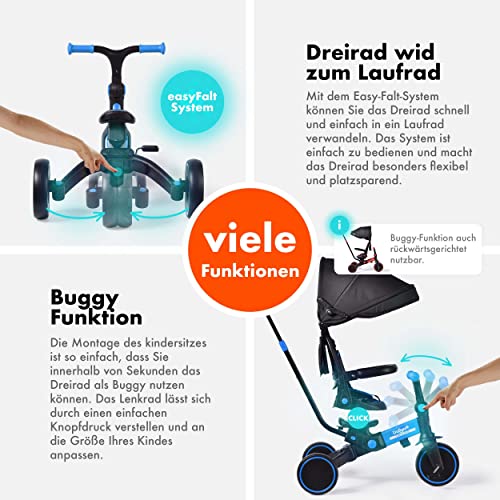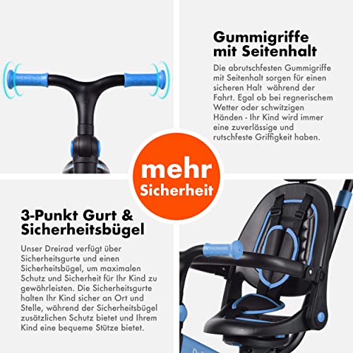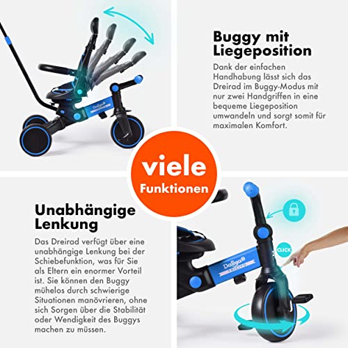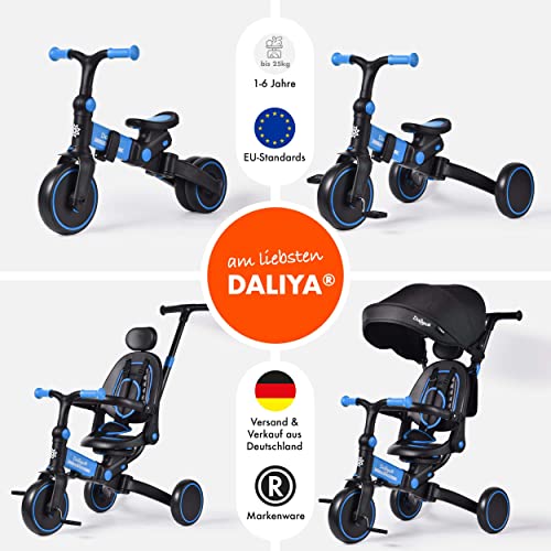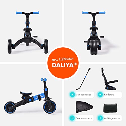 Daliya® 4in1 TRICIYO – Kinderdreirad mit Flüsterräder, Laufrad, Dreirad mit Pedalen, Kinderfahrrad mit Sonnendach, Fahrrad oder Buggy Kinderrad mit Schiebestange, Balance Board bis 25kg (Blau)