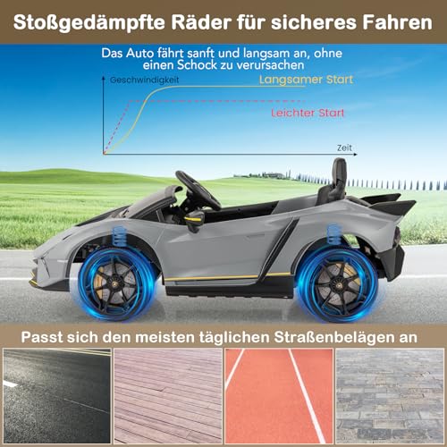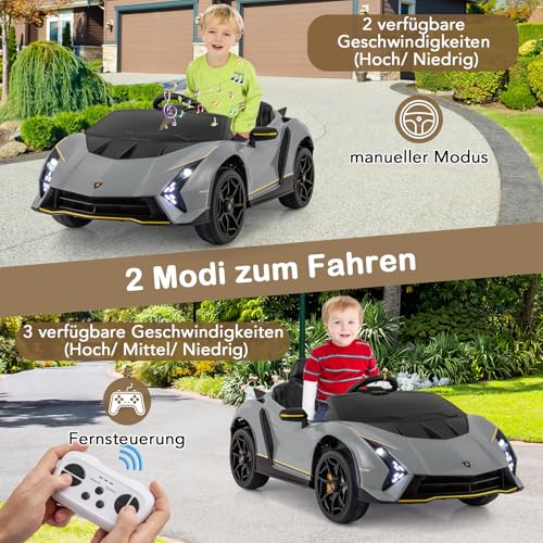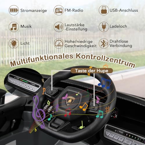 Schenken Sie Ihrem Nachfahre ein einzigartiges Fahrerlebnis mit unserem lizenzierten Lamborghini 12 V Elektroauto für Kinder. Dieses Kinder Elektroauto verfügt über hydraulische Türen, LED-Lichter und einen stylischen Spoiler, die für ein beeindruckendes Fahrerlebnis sorgen. Die Kinder können selbst fahren, oder die Eltern können das Fahrzeug mit der mitgelieferten Fernbedienung lenken. Der verbunden machende Schaukelmodus sorgt für zusätzlichen Nervenkitzel.