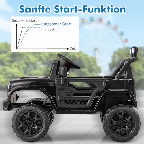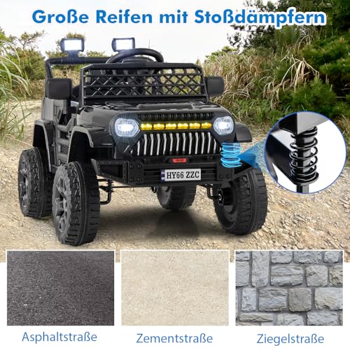 Echtes Fahrerlebnis – Kleine Fahrer tritt in das Pedal und fahren das Kinder Elektroauto mit 25W Motoren. Mit der Hupe, hellen LED-Scheinwerfern und Rücklichtern und einer Windschutzscheibe aus Gitter bietet der coole Geländewagen den Kindern ein lustiges Fahrerlebnis.