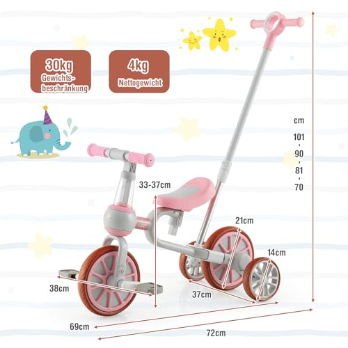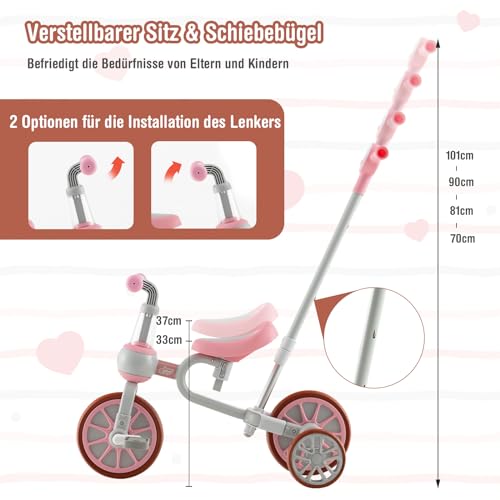 4-abgestuft höhenverstellbarer Schiebegriff – Anders als andere Dreiräder für Kinder verfügt dieses Laufrad über einen 4-abgestuft verstellbaren Schiebegriff (71/81/90/101 cm), den Eltern bequem an ihre Körpergröße gleichsetzen können.