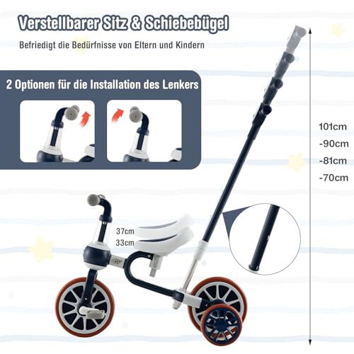 2 verschiedene Sitzhöhen – Dieses Dreirad ist mit einer 2-abgestuft verstellbaren Sitzhöhe (33 cm/37 cm) ausgestattet, die besser zu Ihrem Abkömmling passt, wenn es größer wird. Darüber hinaus kann der Lenker in 2 Richtungen montiert werden, sodass Kinder unterschiedlichen Alters ihn bequem und problemlos greifen können.