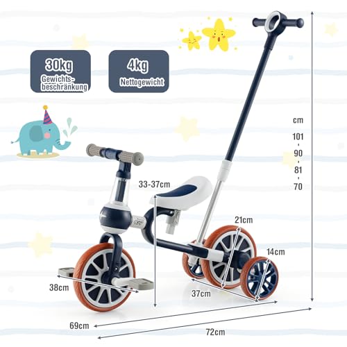 4-abgestuft höhenverstellbarer Schiebegriff – Anders als andere Dreiräder für Kinder verfügt dieses Laufrad über einen 4-abgestuft verstellbaren Schiebegriff (71/81/90/101 cm), den Eltern bequem an ihre Körpergröße angleichen können.