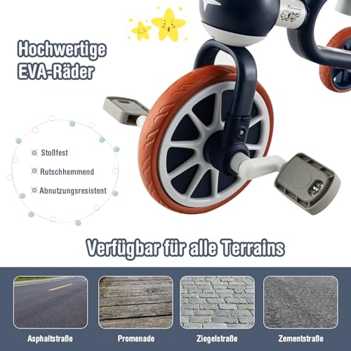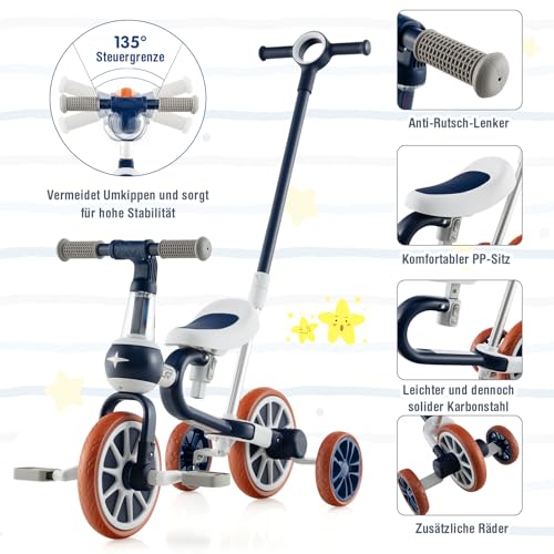 Dies sind die 4 Modi, aus denen Ihr Abkömmling Entscheidung kann, nämlich Schieberad, Dreirad, Lauflernhilfe und Laufrad, je nach Alter. Und auch die Sitzhöhe lässt sich in 2 Spezifizieren (33cm/37cm) verstellen. Nachdem alle Anpassungen vorgenommen wurden, kann Ihr Abkömmling dieses Kleinkindfahrrad mit hochwertigen EVA-Rädern drinnen oder draußen fahren. Egal wo es fährt, die 135°-Lenkbegrenzung macht dieses Dreirad für Kleinkinder immer gefestigt. Wenn Ihr Abkömmling zu müde zum Fahren ist, können Sie dieses Kinderdreirad mit dem 4-abgestuft verstellbaren Schiebegriff nach vorne schieben. Wenn Sie auf Treppen stoßen, können Sie dieses Kinderfahrrad mit 3,5 kg Nettogewicht leicht verankern.