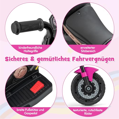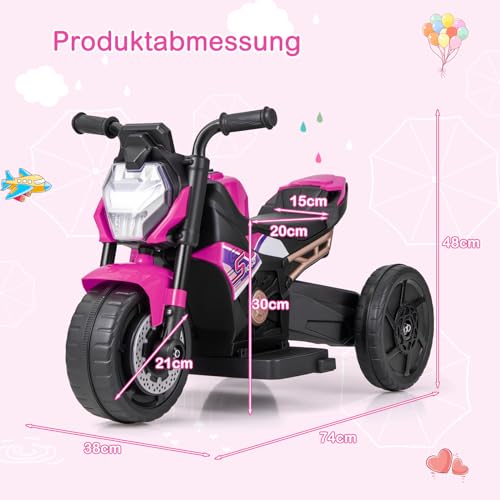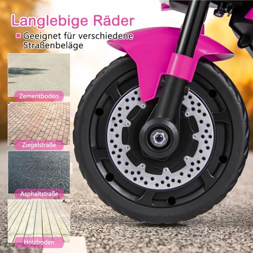 Das neuartige Kinder Motorrad lässt sich leicht in ein 3- oder 2-Rad-Fahrzeug umbauen, adäquat für 18-36 Monate alte Kinder. Dank der integrierten Stützräder können Kinder das Elektromotorrad gefestigt fahren. Wenn die Kinder älter werden, können Eltern die Stützräder auch abebben. Angetrieben von einem 6-V-Akku und einem Motor sorgt dieses Kindermotorrad für eine lange Spielzeit und eine Geschwindigkeit von bis zu 3 km/h. Darüber hinaus sorgen helle Scheinwerfer, Musik und Hupe für zusätzlichen Spaß. Durch das Motorradfahren können Kinder ihre Hand-Auge-Koordinierung, ihr Gleichgewicht und ihre motorischen Fähigkeiten verändern.
