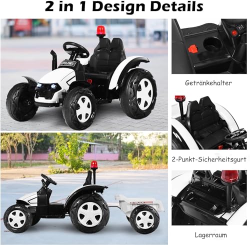🚜2-in-1 Traktor – Der Anhänger am Heck des Kindertraktors kann abgenommen werden. Dadurch kann der Traktor nicht nur allein genutzt werden, sondern es können auch Kinderspielzeug, Geschenke und andere Gegenstände in der Aufbewahrungsbox am Heck verstaut werden. Darüber hinaus verfügt der Traktor über einen Getränkehalter.