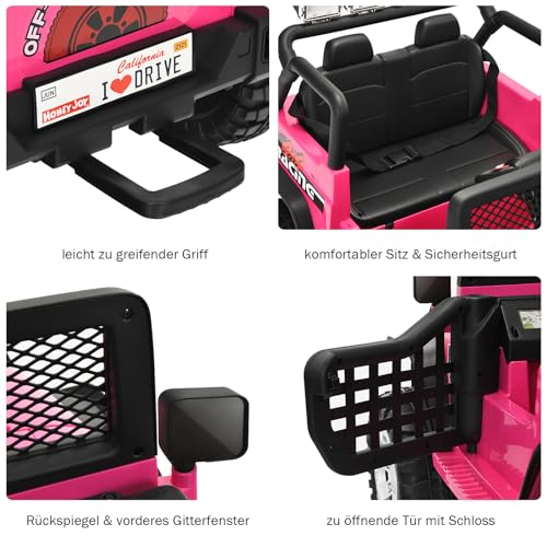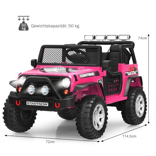Dieses Kinder Elektroauto ist mit einer Gitterfrontscheibe, ultrahellen LED-Leuchten und zwei Türen ausgestattet und sorgt für grenzenlosen Fahrspaß. Das Sanftanlaufdesign vermeidet den plötzlichen Abreise und fördert das Fahrerlebnis. Die Kinder fahren mit dem Auto und können sich vorwärts oder rückwärts bewegen. Außerdem gibt es einen Schaukelmodus für etwas Mannigfaltigkeit beim Spielen. Für Kinder, die zu klein sind, um das Lenkrad und das Fußpedal zu bedienen, lässt sich das 12-V-Kinderauto mit einer praktischen Fernbedienung auch von den Eltern steuern.