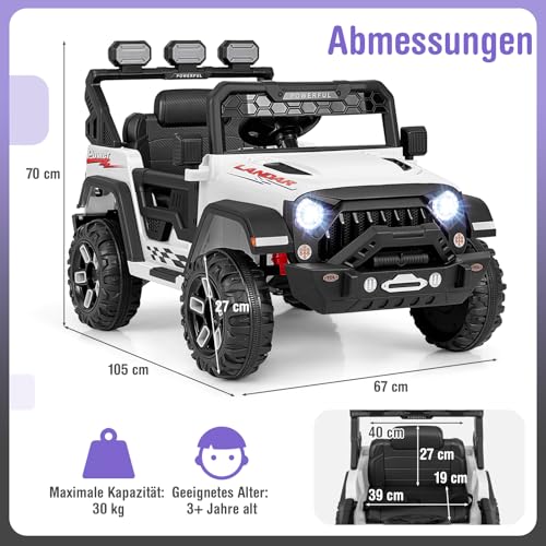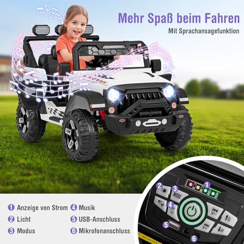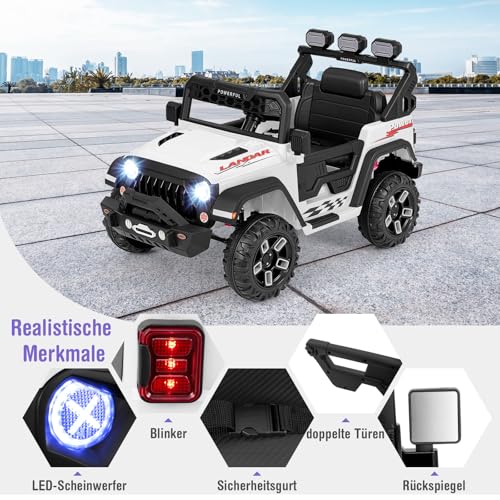 Aufregendes Fahrerlebnis – Tauchen Sie ein in ein aufregendes Fahrerlebnis mit einem geräumigen Sitz, Sicherheitsgurt und interessanten Funktionen, einschließlich der schwenkbaren Rückspiegel. Dieses Kinder Elektroauto ist das ultimative Spieltreffen auf Rädern und lädt kleine Hasardeur auf den Fahrersitz ein!