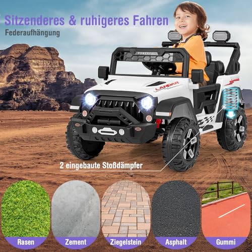 Sanfte Fahrt zu jeder Zeit – Dieser 12V Elektroauto hat eine Soft-Fahrtbeginn-Überführung und eine Federung, die eine aufregende und sanfte Fahrt garantiert. Ob bei einer Party im Garten oder einer Verabredung zum Spielen im Park, die Kinder können die Fahrt genießen.