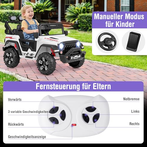 Zwei Fahrmodi – Kinder können dieses Elektroauto mit dem Lenkrad und dem Gaspedal bei einer Geschwindigkeit von 2-5 km/h steuern. Außerdem können die Eltern das Fahrzeug mit der Fernbedienung in 3 einstellbaren Geschwindigkeiten (1-5 km/h) steuern, um die Interaktion zwischen Eltern und Nachkomme zu umwandeln.