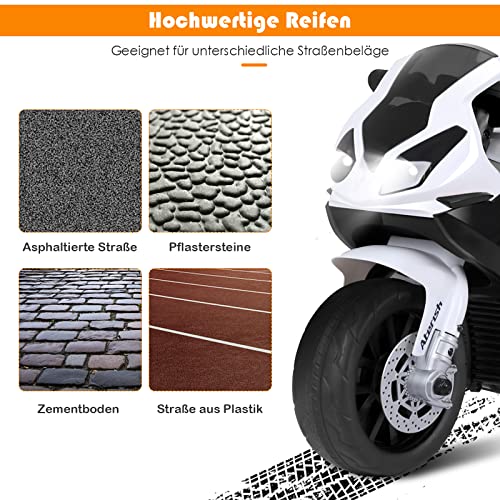 Attraktives Design – Die Musik des Kindermotorrads begleitet Kinder beim Spielen, was mehr Freude macht. Das Design der coolen Scheinwerfer lässt das Glück der Kinder bis in den Abend hinein bestehen. Kinder können nach der Schule viel Spaß haben und eine gute Kindheit verbringen.