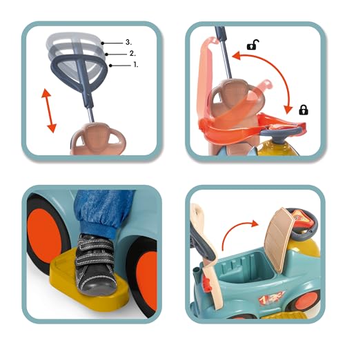 Sie ist mit einem in 3 Positionen verstellbaren Griff für den Komfort der Eltern ausgestattet und hat einen idealen Kofferraum für Spielzeug oder Zubehör, was das Spielen zu einer organisierten und spaßigen Erfahrung macht