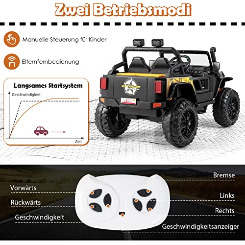 🚙2 Steuerungsmodi: Dieses coole vierrädrige Elektroauto wird in zwei Modi gesteuert. Einerseits können die Eltern das Auto vorwärts, rückwärts, mit hoher oder niedriger Geschwindigkeit über die Fernbedienung steuern, dennoch können ältere Kinder es frei steuern. Darüber hinaus verhindert das Langsamstart-System, dass das Fahrzeug überraschend beschleunigt und das Nachkomme verletzt.