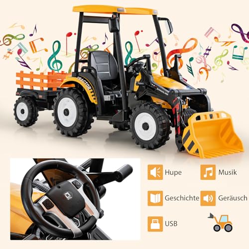 🚧Realistisches Fahrerlebnis: Dieses Aufsitztraktor ist mit einem realistischen Lenkrad, Hupengeräusch sowie Scheinwerfern und Musikfunktion ausgestattet, damit Ihre Kinder ein echtes Fahrgefühl erleben können. Darüber hinaus hat dieses Aufsitztraktor 6 langlebige, strapazierfähige Räder an der Unterseite für eine reibungslose Fahrt aka auf unebenem Boden.