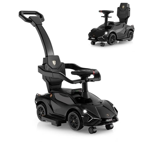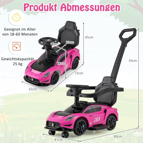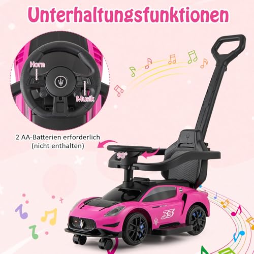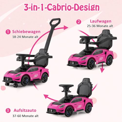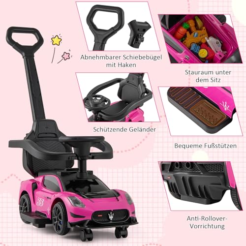 GOPLUS 3 in 1 Rutschauto Mazerati, Rutscherfahrzeug mit abnehmbarem Griff, Geländer & Stauraum unter dem Sitz, Schiebauto mit Hupe & Musik, für Kinder von 18-60 Monaten (Rosa)