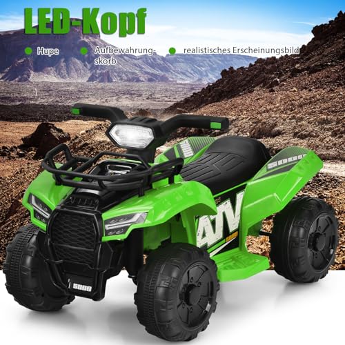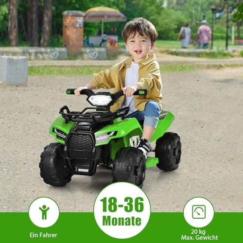 Wecken Sie mit diesem lebensechten Elektroquad die Abenteuerlichkeit Ihrer Kinder! LED-Scheinwerfer und Hupengeräusche sorgen für ein lustiges und realistisches ATV-Erlebnis. 4 verschleißfeste Räder helfen Kindern, auf allen Untergründen belastbar zu fahren, einschließlich Betonstraßen, Holz- oder Asphaltböden, Kunststoffpisten usw. Drücken Sie den Knopf am Griff, um zu an Fahrt gewinnen, und lassen Sie ihn los, um zu verlangsamen und anzuhalten, was für Ihr Baby wirklich einfach zu bedienen ist. Das Miniquad ist glatt, leise und erschütterungsfest, Ihr Kleines wird sich in wenigen Minuten daran gewöhnen.