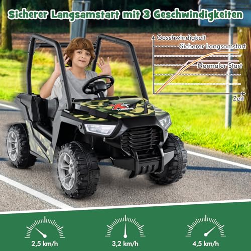 Hochleistungsmotoren & Batterie: Mit leistungsstarken dualen 24V Motoren sorgt dieses Kinder-UTV für aufregende Fahrten mit 3 verstellbaren Geschwindigkeiten. Der 24V 5Ah Stromspeicher garantiert 1-2 Stunden kontinuierliches Spielvergnügen mit einer vollen Ladung, ideal für stundenlangen Fahrspaß.