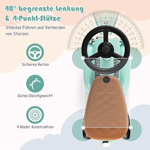 Sicheres & unvergessliches Fahrvergnügen: Mit einem sicheren Lenksystem, das Drehungen auf 40°beschränkt, sorgt dieses Rutschauto für sichere Fahrerlebnisse und bietet gleichzeitig endlosen Spaß und Entdeckungen. Außerdem ermöglicht das flexible Lenkrad den Kindern, sich mühelos nach links und rechts zu drehen.