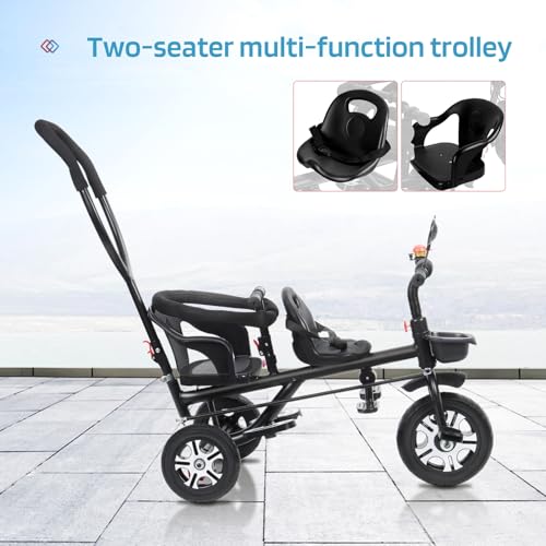 Haibinsuo Tandem-Dreirad mit Doppelsitz und Aufbewahrungskorb für Kinder von 2 bis 8 Jahren, Räder aus Gummi, kippsicher, stoßfest, Baby-Buggy, stoßfest, Spiegel