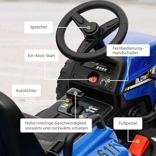 HAUSPROFI 12V 3-Gang Kinder Traktor mit 2 Fahrmodi, 2.4G Fernbedienung, Soft-Start, Elektro Traktor mit Anhänger, LED-Lichtern, Bluetooth, Musik, USB, ideal für Kinder ab 3 Jahren, Blau