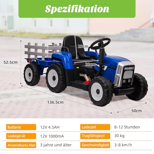 [Abnehmbarer großer Anhänger]: Unser Kinder Elektroauto wird mit einem großen Weiser geliefert, in dem Kinder Spielzeug, Blumen, Stroh und mehr transportieren können. Ein einfaches Schraubensystem ermöglicht es, den Weiser schnell vom Traktor abzunehmen, darum die Kinder das Vergnügen eines Vier-Räder-Fahrzeugs erleben können.
