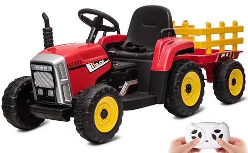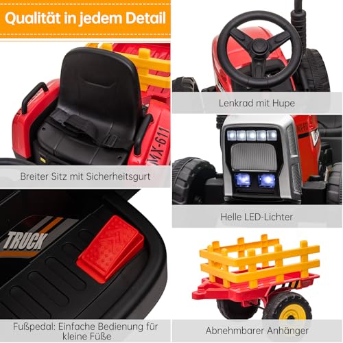 HAUSPROFI 12V Kinder Elektroauto mit 2 Fahrmodi, Fernbedienung, 3 Geschwindigkeitsstufen, Soft-Start, Elektrotraktor mit Anhänger, LED-Lichtern, Bluetooth, USB Musik, ideal für Kinder ab 3 Jahren, Rot
