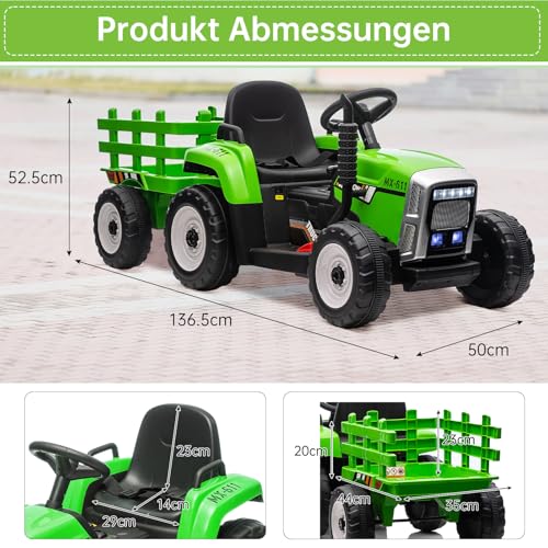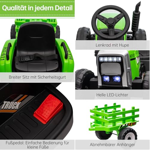 HAUSPROFI 12V Kinder Elektroauto mit 2 Fahrmodi, Fernbedienung, 3 Geschwindigkeitsstufen,Soft-Start, Elektrotraktor mit Anhänger, LED-Lichtern, Bluetooth, USB Musik, ideal für Kinder ab 3 Jahren, Grün