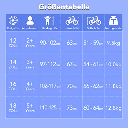 Geltungsbereich und Ausstattung: 12 Zins angemessen für Kinder 2 Jahre(ca. 80-105cm),14 Zins angemessen für Kinder 3 Jahre(ca. 90-125cm), 16 Zins angemessen für Kinder 4 Jahre(ca.105-135cm). Das 14 Zins Fahrrad ist mit Stützrädern ausgestattet, ohne Ständer. Das 16 Zins Fahrrad ist mit Ständer ausgestattet, ohne Stützräder.Bitte überprüfen Sie die Größentabelle auf dem Überführung. Die Größentabelle enthält detailliertere Daten, um festzustellen, ob Ihr Abkomme für dieses Fahrrad angemessen ist.