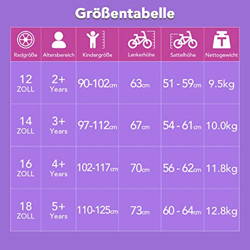 Schönes Design: Dieses Fahrrad ist ein absoluter Hingucker. Es hat ein stilvolles Design und ist in Weiß, Rosa und Lila erhältlich, was ermöglicht Ihrem Spross eine coole und komfortable Fahrt.