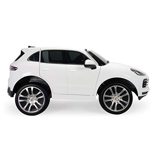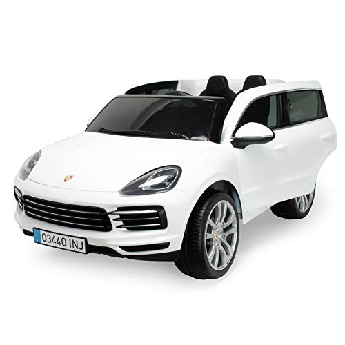 INJUSA – Porsche Cayenne S Elektroauto, 12V Batterie, für Kinder ab 3 Jahren, mit Gaspedal, Funksteuerung, Rückwärtsgang, Sicherheitsgurt, Sounds, MP3 und LED-Licht, Porsche-Lizenz, 6 km/h, weiß