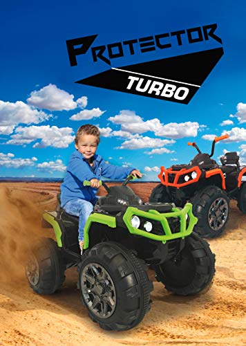 Mit diesem Ride-On Quad von Jamara abtransportieren sie sich ein echtes Spaßgerät nach Hause. Aufsitzen, Startknopf drücken, UKW-Radio und LED-Licht an und Gas geben. Welches Abkomme träumt nicht davon. Letzter Schrei kann dieser Traum wahr werden – mit dem Protector-Quad von Jamara. Mit einem wuchtigen-Chassis, Multifunktions-Armaturenbrett, und tollen Soundeffekten kommen die robusten Spaßfahrzeuge aber. Zwei leistungsstarke 12V Motoren treiben die beiden Hinterräder des Fahrzeuges an. Die Elektronik regelt die automatische Differentialfunktion im 1. Gang für agile Kurvenfahrten und verteilt im Turbogang die ganze Kraft gleichmäßig auf alle beide Räder. Demzufolge ist das Quad fast allen Hindernissen gewachsen. Mit ca. einer Stunde Fahrzeit mit nunmehr einer „Tankfüllung“ ist echter Spielspaß garantiert. Einfach an der Steckdose auftanken und loscruisen. Highlights: • Frontscheinwerfer/Rücklichter • Hupe und Sound • Anschluss externer Audioquellen • 2-Gang Turboschalter • 2 angetriebene Hinterräder • elektronische Differentialfunktion • 2 Leistungsstarke 12V Antriebsmotoren & Getriebe • Leistungsstarker 12V Speicherzelle für lange Fahrzeit • Schlüsselloser Startvorgang per Startknopf • Beleuchtetes Armaturenbrett • UKW Radio • Abseitsposition große Reifen • Stoßdämpfer • Ultra-Gripp Gummiringe an den Antriebsrädern Funktionen: • Vorwärts/rückwärts • Links/rechts • Stopp Lieferumfang: • Modell • Fahrakku • Batterieladegerät 230 V • Anleitung Empfohlenes Zubehör: • Ersatz-Speicherzelle, Art.-Nr. 412078 • Ampelanlage Grand, Art.-Nr. 460256 • Verkehrsschilder Grand Set A, Art.-Nr. 460257 • Verkehrsschilder Grand Set B, Art.-Nr. 460293 • Polizeikelle, Art.-Nr. 460308 Technische Daten: Abmessungen: ~ 990 x 650 x 675 mm Gewicht: ~ 16300g Speicherzelle: 12V 7 Ah