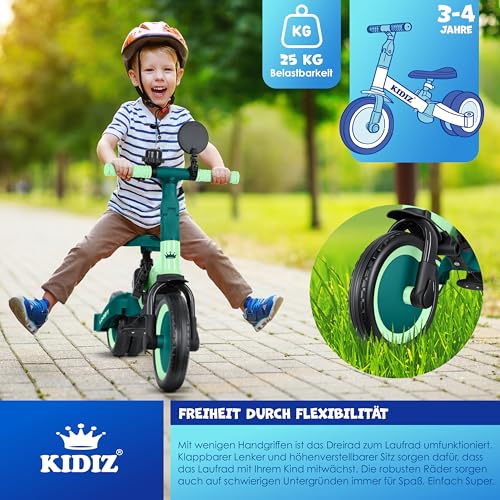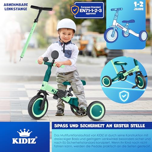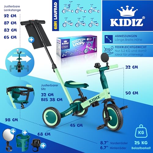 KIDIZ® 6in1 Laufrad Dreirad | Laufräder Lauffahrrad Kinderdreirad ab 1 Jahr bis 5 Jahre | Lauflernhilfe belastbar bis 25Kg | inkl. Lenkstange Sicherheitsbügel Sicherheitsgurt Klingel & Spiegel Grün
