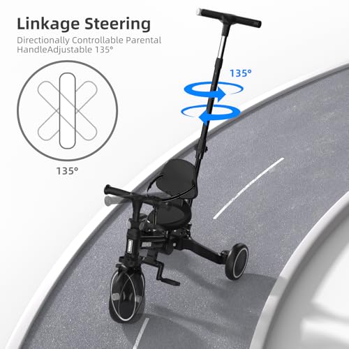 【Gestängegesteuerte Schubstange & Lenker】Spezialisiertes Design – Der hintere Schiebebügel kann die Mitlenkung des vorderen Lenkers steuern, 135° Drehbar. Die Geschwindigkeit und Fahrtrichtung des Dreirads werden von den Eltern kontrolliert, um Ihre Kinder vor Verletzungen oder Stürzen zu schützen. 4-abgestuft verstellbaren Höhe der Schubstange von 90cm bis 105cm, danach auf verschiedene Größen der Eltern auf dieselbe Ebene stellen zu verwenden.