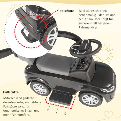 Lemodo Rutschauto ab 1 Jahr – Rutscherfahrzeug schwarz Kinderfahrzeug mit Schiebestange und Sicherheitsbügel, Rutscherauto mit Staufach und Sound-Lenkrad, Lizenziertes Kinderspielzeug von Land Rover