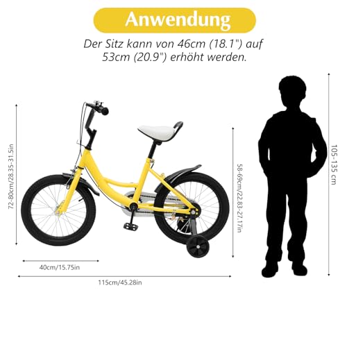 Anwendung: Dieses 16-Aufwand-Fahrrad ist für Kinder mit einer Körpergröße von 105 cm bis 135 cm (normalerweise im Alter von 5-8 Jahren) geeignet. Der Sitz kann von 46cm (18.1″) auf 53cm (20.9″) erhöht werden.