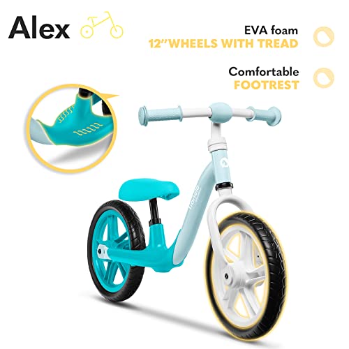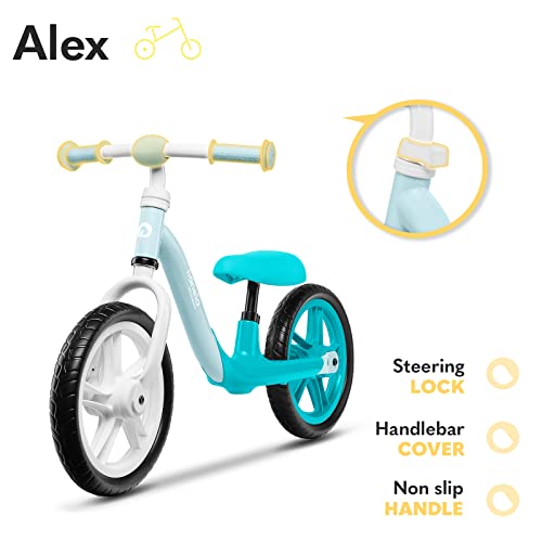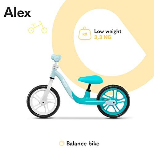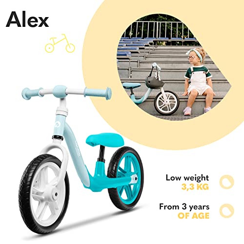 Das Laufrad Alex wiegt dagegen 3,3 kg, so dass das Kleinkind problemlos alleine bergauf fahren kann. Ein weicher Sattel sorgt für Komfort bei den Ausflügen.Die kleine, geprägte Fußstütze ermöglicht es dem Fahrer, seine Beine auszuruhen, wenn das Rad an Geschwindigkeit gewinnt
