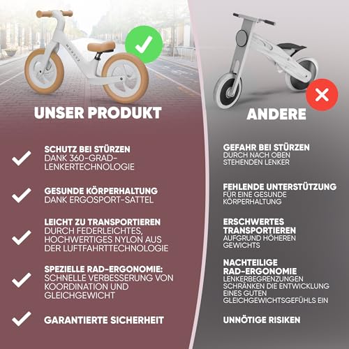 𝗘𝗶𝗻 𝗮𝘂𝘀𝗴𝗲𝗸𝗹ü𝗴𝗲𝗹𝘁𝗲𝘀 𝗦𝘆𝘀𝘁𝗲𝗺 macht unser Laufrad zur besten Abstimmung. Dazu gehören u.a. die integrierte Fußstütze zur Verbesserung des Gleichgewichtssinns, der tiefe Rahmen für bequemes Auf- und Nächtigen, rutschfeste Lenkradgriffe, Stabilität, Langlebigkeit, federleichtes Gewicht, einfache Monatge und ein höhenverstellbarer Sattel.