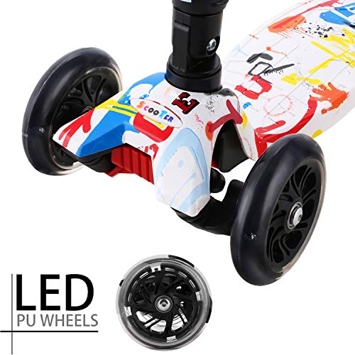 Faltbar und abnehmbar.Der Lenker kann abgeschlossen zusammengeklappt und demontiert werden, wodurch er leicht zu transportieren und zu verstauen ist, und ist geeignet für den Transport im Auto auf Reisen. | Leuchtende LED-Rollen.4 LED Leuchtrollen aus PU Material, das Kugellager der Räder erzeugt eine helle Energie, die den Roller blendender und sicherer auch bei Nacht macht. | Verstellbarer Lenker.Die Größe der Kinder ändert sich schneller, so dass die verstellbare Höhe des Tretrollers mit drei Rädern länger die Kindheit des Kindes begleiten kann. | Hinterradbremse mit zwei Rädern.Drücken Sie sanft auf die Bremsplatte mit Ihrer Ferse, um den Dreirad-Roller zu abbrechen. Die Reaktion auf die Bremsleistung ist empfindlich und vermeidet unerwartete Situationen. |