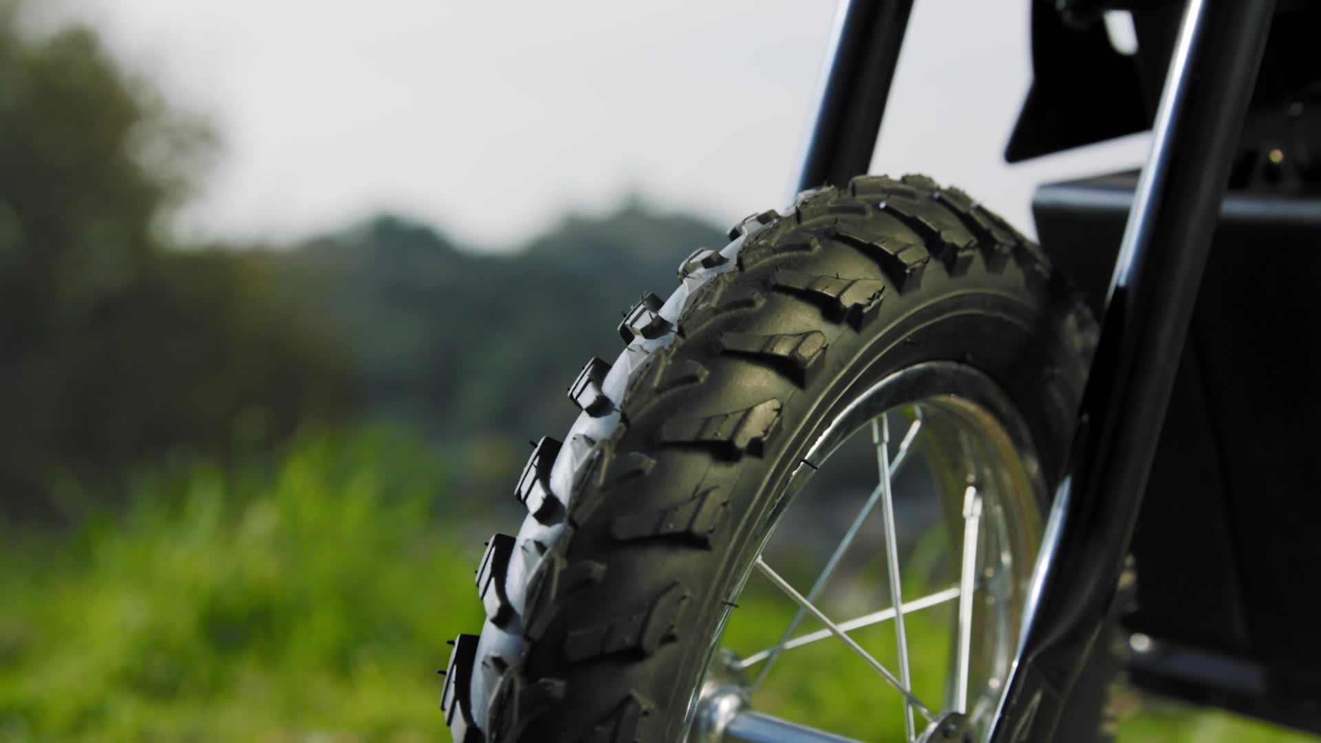 Verfügt mittels einen querstangenverstärkten Lenker, Speichenräder unter Zuhilfenahme von 12″ pneumatische, Knobbytires, einziehbaren Kickstand des Weiteren handbetriebene Hinterradbremse
