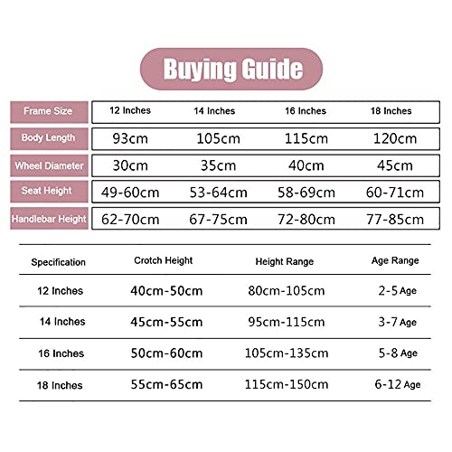 【Anwendungsbereich】Fahrräder sind für alle Jungen und Mädchen geeignet. 12 Taxe ist geeignet für 2-5 Jahre mit einer Körpergröße von 80-105 cm, 14 Taxe ist geeignet für 3-7 Jahre mit einer Körpergröße von 95-115 cm, 16 Taxe ist geeignet für 5-8 Jahre mit einer Körpergröße von 105-135cm und 18 Taxe ist für 6-12 Jahre mit einer Körpergröße von 115-150cm geeignet. Die Größentabelle enthält detailliertere Informationen.